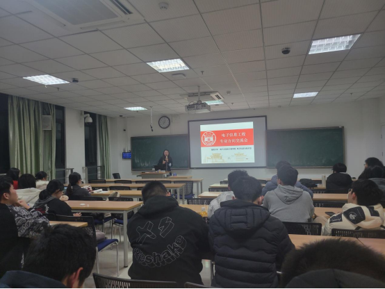 之后,陶明老师向我们介绍了电子信息工程专业方向的基本情况,科研方向和就业前景,促生了我们前进的动力,结合本科生培养方案,指明了我们奋斗的方向。
