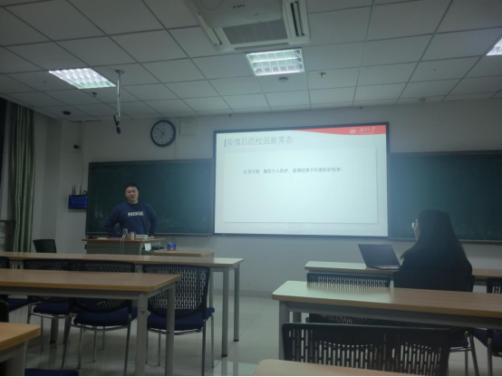 随后,着眼于当下,班长阐述了疫情过去后的校园新常态,即如何做好个人防护,以及平衡协调学业与生活,此外还结合期中期末成绩,强调了其重要性。