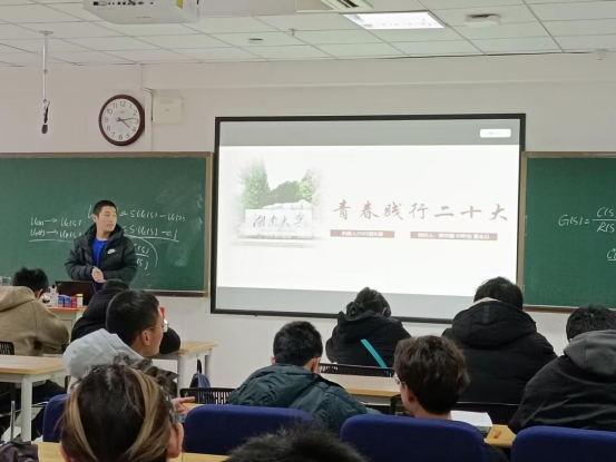 班会上,郭宗灏介绍讲解了二十大的重大原则、“四个意识”、 “四个自信”等重要内容,并组织同学分享自己学习二十大精神的体会。
