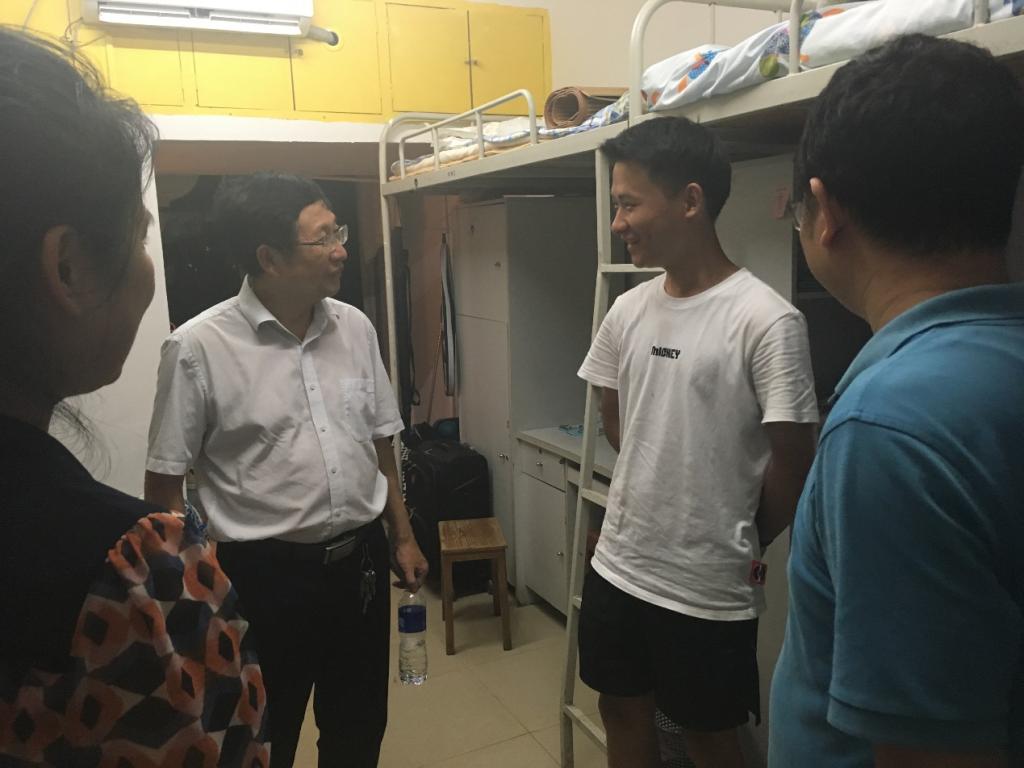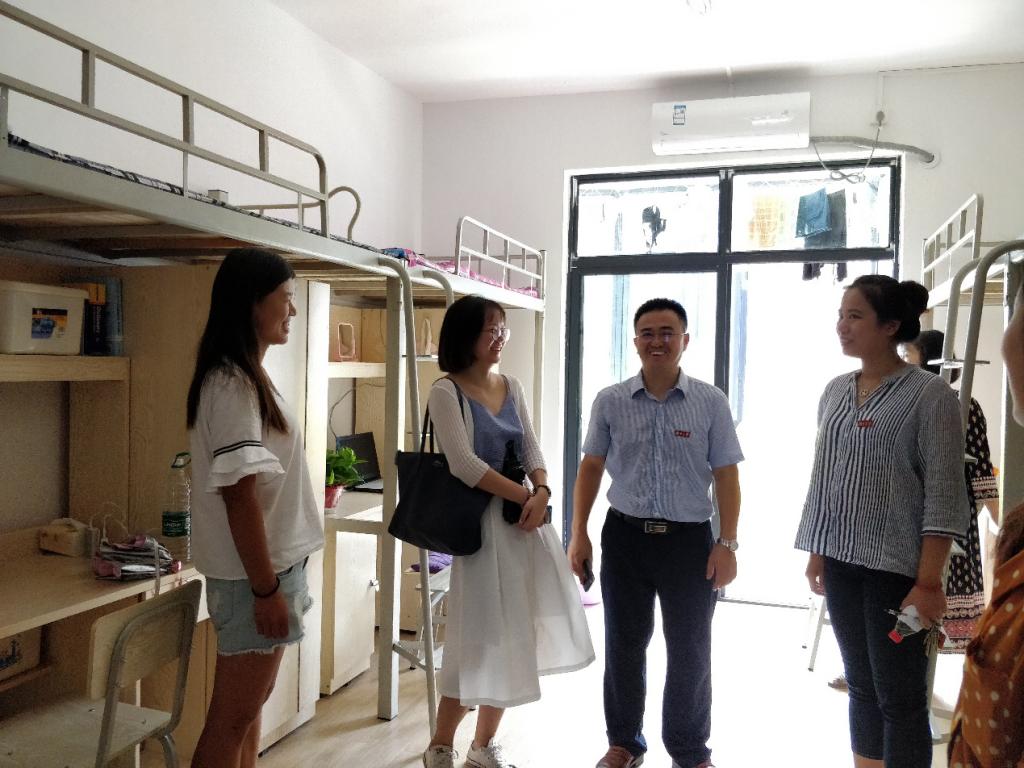 十三舍女生宿舍,看望学院新生。张书记一行首先来到一楼,与宿舍管理员交流,了解楼栋学生分布和新生登记入住情况,并对宿舍管理员的辛勤工作表示感谢。