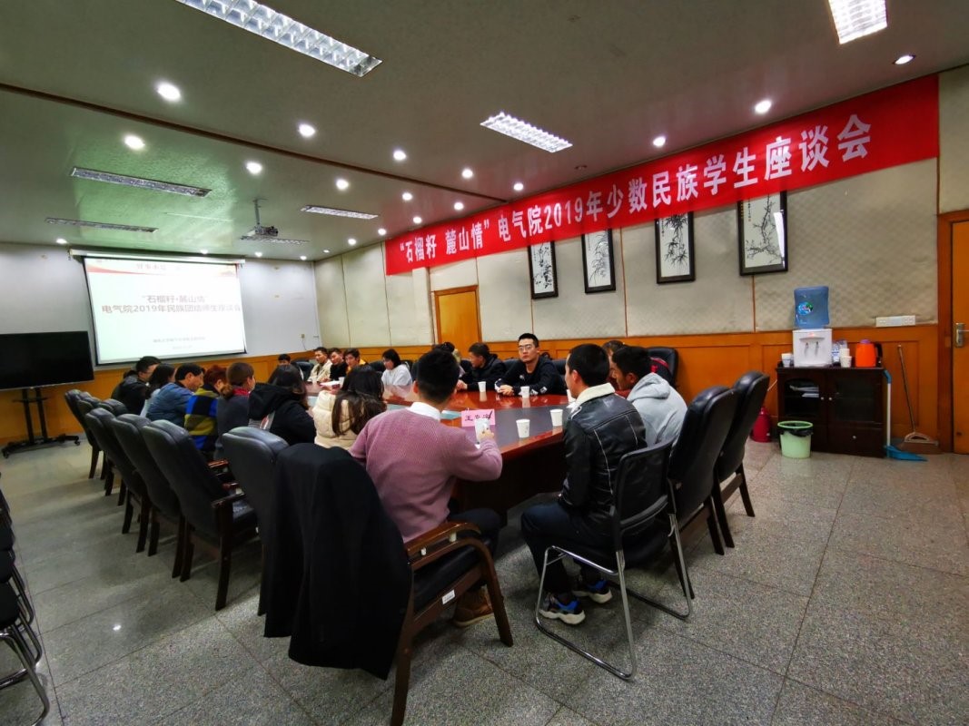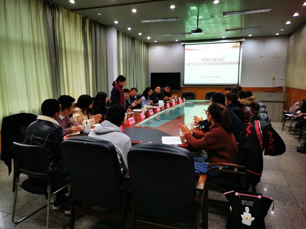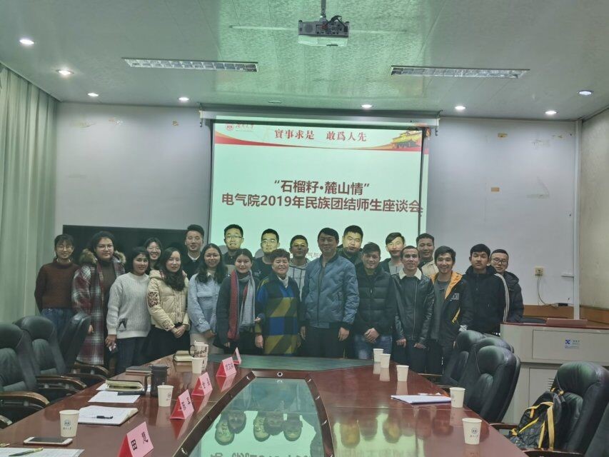 11月27日中午12:30,“石榴籽,麓山情”电气院2019年民族团结座谈会在院楼219会议室举行。学工部田慧老师、布阿提开姆老师和电气院陈军书记,以及各年级辅导员参加了座谈会。座谈会由学院2017级本科生辅导员兼资助兼干金晶老师主持。