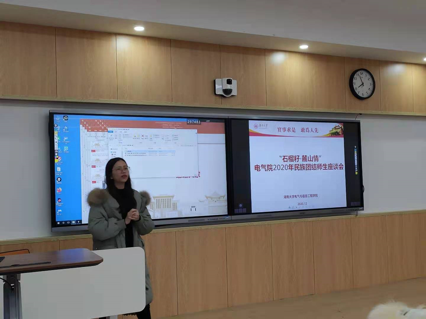 12月15日下午18:50,2020年电气院“石榴籽·麓山情”少数民族学生座谈会在中楼401举行。湖南省民族团结教育名师工作室田慧工作室首席专家田慧老师、党委学生工作部布阿提开姆老师、卡丽比努尔老师、各年级辅导员、各年级少数民族同学参加了座谈会。座谈会由2017级本科生辅导员兼民族团结兼干金晶老师主持。