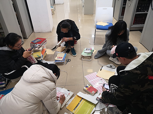 在一楼,同学们帮助老师整理书籍的编号条码。他们分为两个小团队,围坐成两个小圈。看着每个圈中小山似的书籍,同学们分工明确,有的同学负责检查图书的装订,有的同学负责检索图书的编号,有的同学负责书写并粘贴新的编号条码。正如弗洛姆说过:“给予本身即是无与伦比的欢乐。”或许同学们身体劳累,但在志愿者活动的过程中,同学们的内心却是快乐的。
