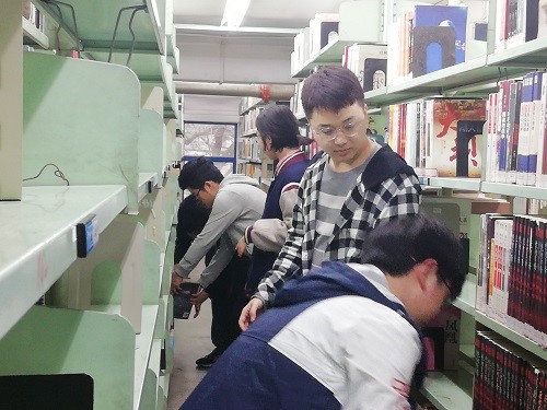 同学们刚上完体育课便前往图书馆开始志愿者活动,刚上完体育课的疲惫也并没有消减同学们做志愿活动的热情,3月15日下午四点二十分,27名同学准时在图书馆二楼集合。按照安排,团支书将参与活动的同学们分成了三大组,分别前往一楼,三楼和四楼。分组完成后,大家前往自己所属的小组,在图书馆老师的安排下,领取好劳动工具之后便迅速投入到各自的志愿任务中。