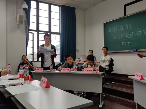 首先正反方各自进行自我介绍,并开始立论。电自2班作为正方首先进行立论。一辩选手语言精练,从表情包具有的独特性,趣味性,普遍性三个论点立论证明表情包会提高人们的交流效率。在反方三辩盘问过程中,正方一辩冷静作答,在坚持自己的论点同时适时抓住对方论点中的破绽予以反击,成功立论。