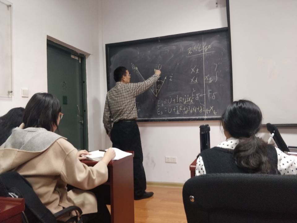 电磁变换电机转,数学建模破疑难。 电机学课题组负责老师罗隆福老师与参与座谈会的同学们就电机学学习过程中的问题进行了深入的探讨交流。对于如何让抽象的电机学知识具体化,罗老师强调学习电机“要转变思路,学习理论知识要结合对象”,并指明学习电机学要分三步走,第一步,数学建模来简化,等值电路细品味,第二步,电路知识要搞懂,基本概念要牢记,第三步,电机结构记心中,元件原理要弄清。对于疑难点,罗老师还拿起粉笔为同学们梳理了思路,满满是对学生们的帮助和关怀。