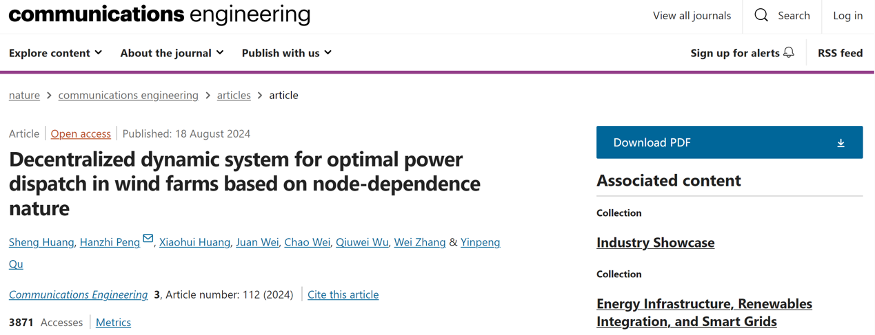 相关研究成果以“Decentralized dynamic system for optimal power dispatch in wind farms based on node-dependence nature”为题在线发表在《Nature》旗下首个专注于工程领域的期刊《Communications Engineering》杂志上。这是该期刊首次刊发的风力发电领域相关论文。
