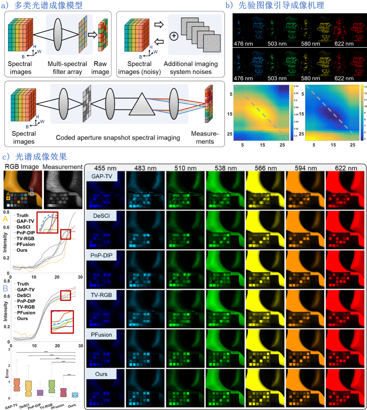 机器人学院、机器人视觉感知与控制技术国家工程研究中心王耀南院士团队聚焦“高效快照式光谱成像”关键技术,构建了一系列原创成像模型,融合了先验引导与低秩分解等新型算法,搭建了集硬件设计—成像建模—低维观测—高质重建于一体的光谱成像方法框架,研制出弱光照快速高光谱成像系统。