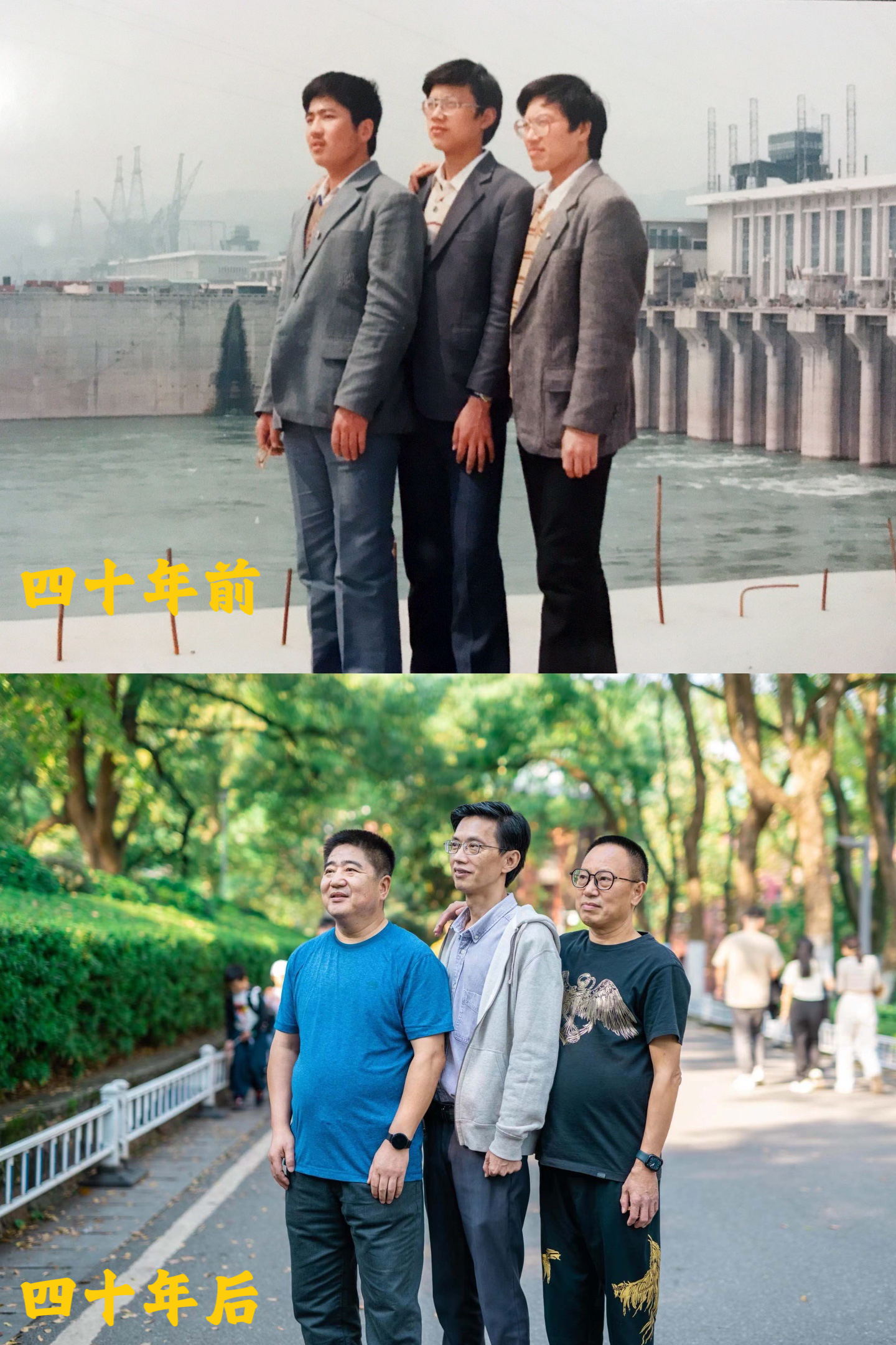 40年以后,重返母校,回忆往昔,同学们故地重游,再现了同人同地的老照片翻拍。